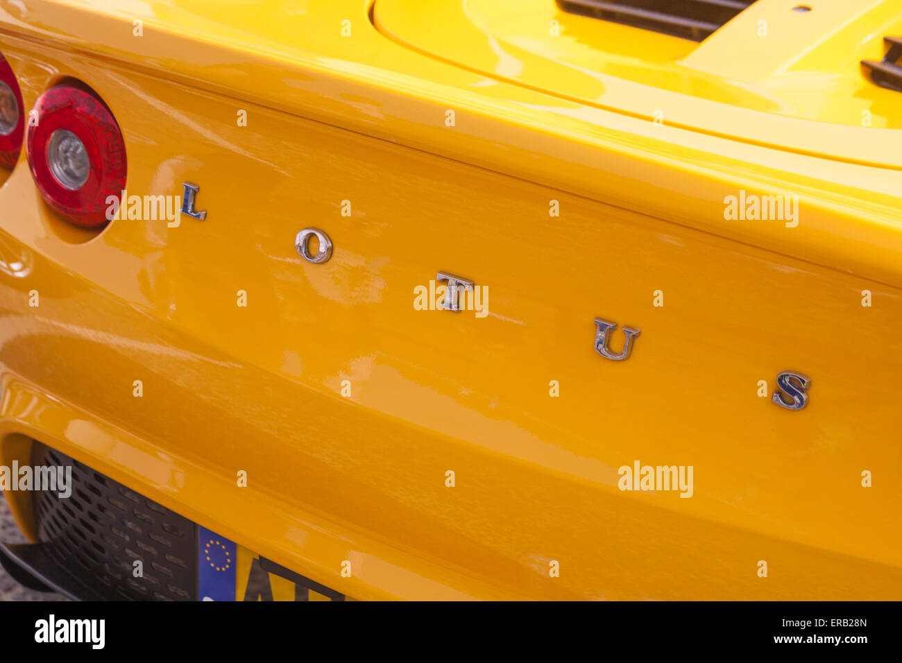 Yellow Lotus Sports Car Rear Detail With Name Badge Stock Photo Alamy